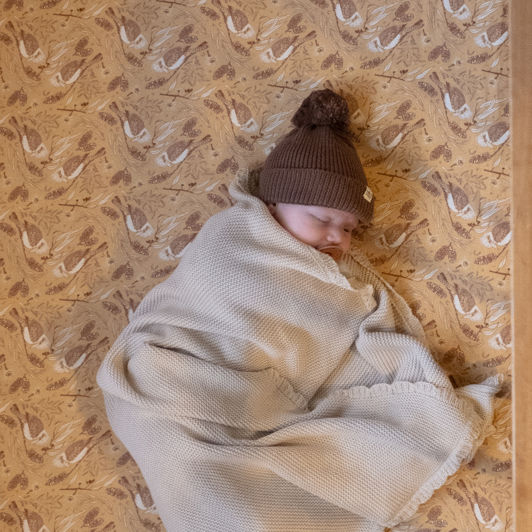 Keep baby cosy and cute in our beanie. Handmade from soft 100% organic cotton. Soft and stretchy for your little newborn. One size available: newborn.